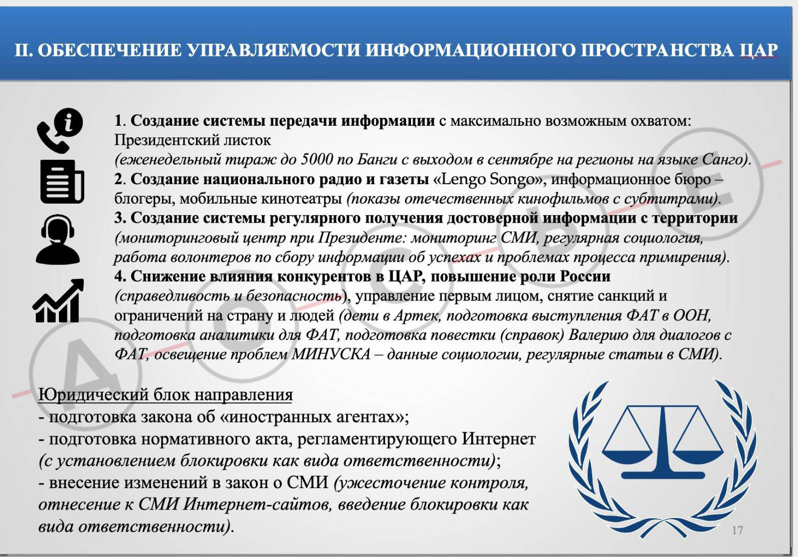 Особое внимание в ЦАР, Мали и Буркина-Фасо сотрудники «Компании» уделили продвижению закона об иностранных агентах по российскому образцу. В одном из отчетов указано, что российские политтехнологи рекомендовали властям Буркина-Фасо осуществить аресты «иностранных агентов», а также прекратить вещание французских СМИ. В ЦАР пригожинские политтехнологи продвигают идею принятия закона об иноагентах по крайней мере с 2018 года. Например, для «обеспечения управляемости информационного пространства ЦАР» они предлагали ввести закон об иноагентах, регламентировать интернет и узаконить блокировки сайтов, а также ужесточить контроль за журналистами и приравнять интернет-сайты к СМИ.
