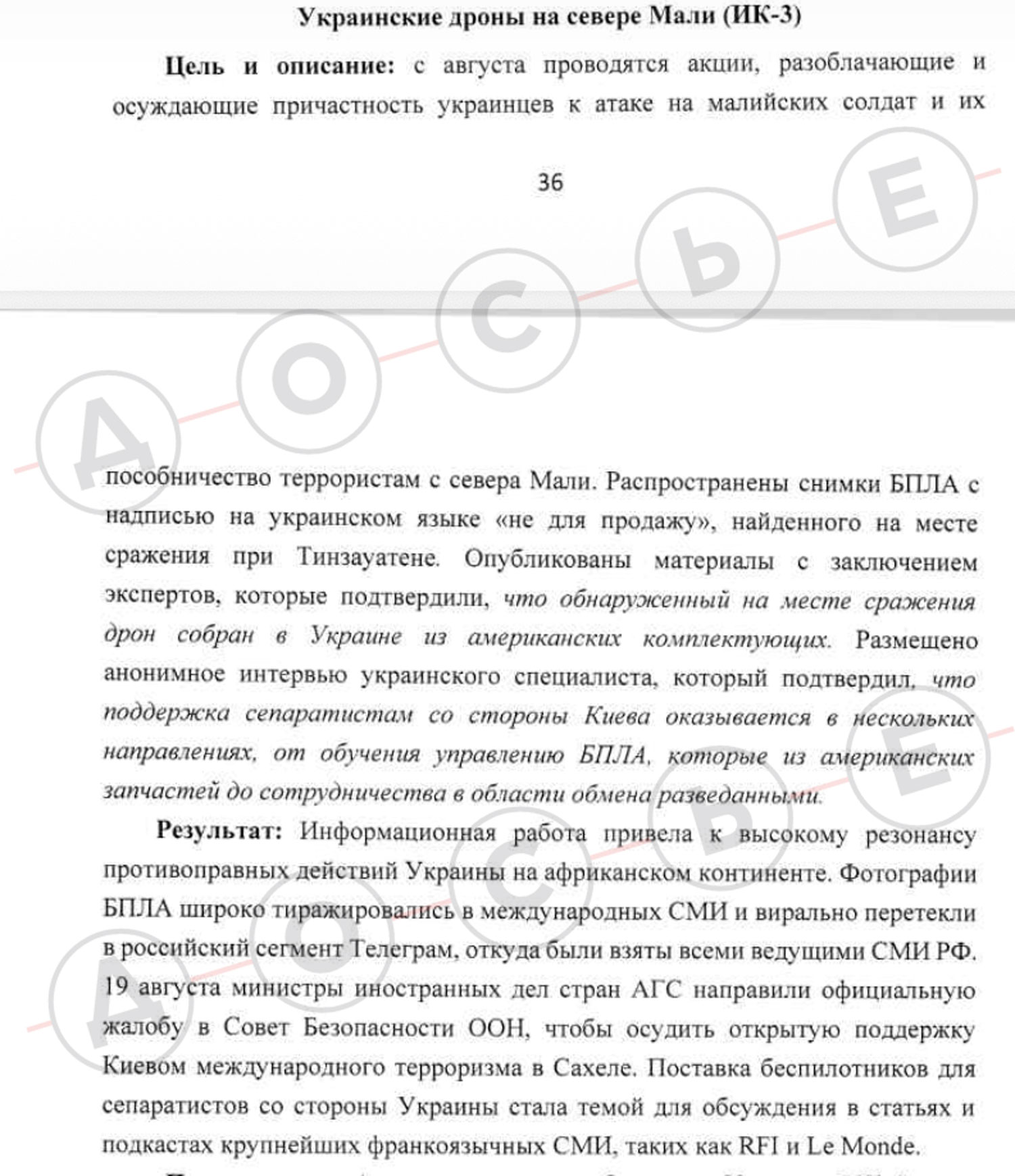 Вскоре деятельность «Компании» стала заметна во франкоязычном инфополе: например, летом 2024 года появилась серия статей о том, как Украина поддерживает террористов в Африке. На малийском новостном сайте Mali Web вышла заметка, в которой утверждалось, что Украина может активно поддерживать террористические группы в Сахеле В зоне Сахеля располагаются следующие страны: Сенегал, Мавритания, Мали, Алжир, Буркина-Фасо, Нигер, Нигерия, Камерун, Чад, Судан и Эритрея × , предоставляя им вооружение и подготовку. Судя по внутренним документам, этот материал обошелся «африканским политологам» в 450 долларов. Проплачены были и другие подобные материалы — за них африканские журналисты получали от 100 до 2000 долларов. Главная цель кампании — снизить уровень поддержки Украины в Африке и на международных площадках.