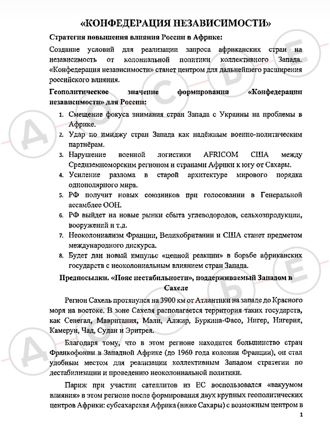 Судя по документам, одна из главных целей присутствия и расширения российской команды в Африке — формирование так называемой «Конфедерации независимости», предполагаемого оплота влияния Кремля. В одном из отчетов указано, что российские сотрудники работают над объединением «пояса дружественных РФ режимов в государствах выше экватора»: Гвинее (Конакри), Мали, Буркина-Фасо, Нигере, Чаде, Судане, Эритрее, Сомали, Эфиопии и других странах региона власти ЦАР, Мали, Буркина-Фасо, Эритреи и Мали уже сотрудничают с «Компанией» × . Планировалось, что «Конфедерация независимости» будет создана после операций «политологов» в Чаде, Судане, ДРК и Сомалиленде и станет крупнейшей антизападной коалицией Африки. В том же отчете сформулированы преимущества этой идеи для Кремля: она должна сместить внимание Запада с Украины на Африку, подорвать образа Запада как надежного партнера и «усилить разлом в старой архитектуре мирового порядка» однополярного мира. Кремль, как обещали политтехнологи, должен был получить «новых союзников при голосовании в Генеральной ассамблее ООН», а также «выйти на новые рынки сбыта углеводородов, сельхозпродукции и вооружений».