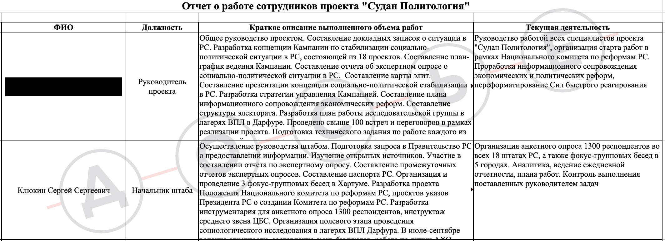 Учредитель «Стратконсалта» Сергей Клюкин как минимум с 2018 года работал социологом в проекте «Судан» и жил в Хартуме. В отчете о работе пригожинских сотрудников он числился «начальником штаба», в его обязанности входили разработка реформ и проектов указов президента в Судане, анкетные опросы и фокус-группы.