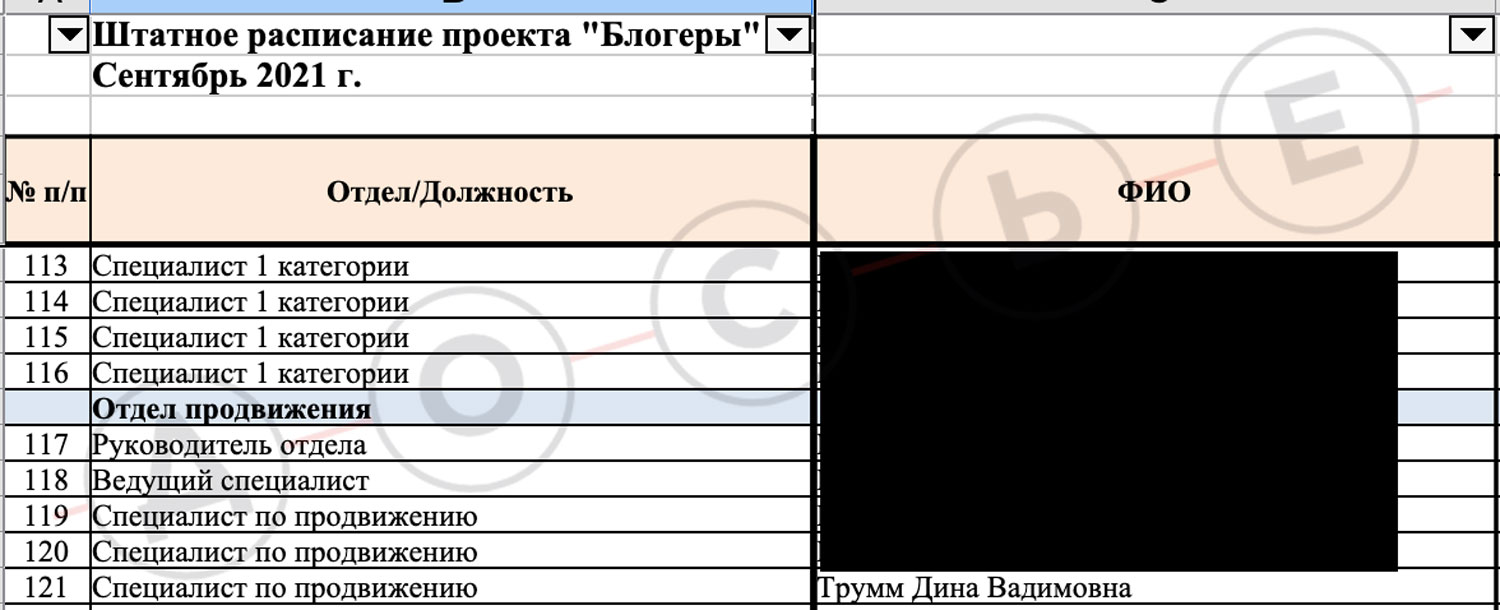 В числе вспомогательного персонала в документах упоминается Ксения Соболева. Она заказывала фейковые аккаунты на Facebook и управляла бюджетами по продвижению русскоязычного телеграм-канала «Суверен» с 9 тысячами подписчиков, который обещает раскрыть тайны Африки, Латинской Америки и Ближнего Востока — тех регионов, в которых сотрудники «Компании» активно работали. Помимо покупки подписчиков канала Соболева также платила за репосты публикаций «Суверена» в «Арабской Африке», «Галопом по Африкам», «Алжире сегодня», SHARQ и Abbas Djuma. В этом ей помогала бывший пригожинский «специалист по продвижению» в проекте «Блогеры» Дина Трумм.