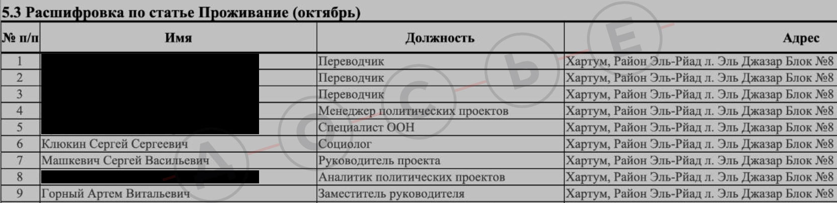 Замдиректора по ИТ «Стратконсалта» Артем Горный был старым коллегой Клюкина. В документах «Компании», имеющихся в распоряжении «Досье», он числился бухгалтером и занимался документооборотом и размещением сотрудников «Компании», а к 2019 году перешел на позицию замруководителя проекта «Политология Судан». В апреле 2024 года новая фирма наняла и бывшего главу суданского проекта Сергея Машкевича.