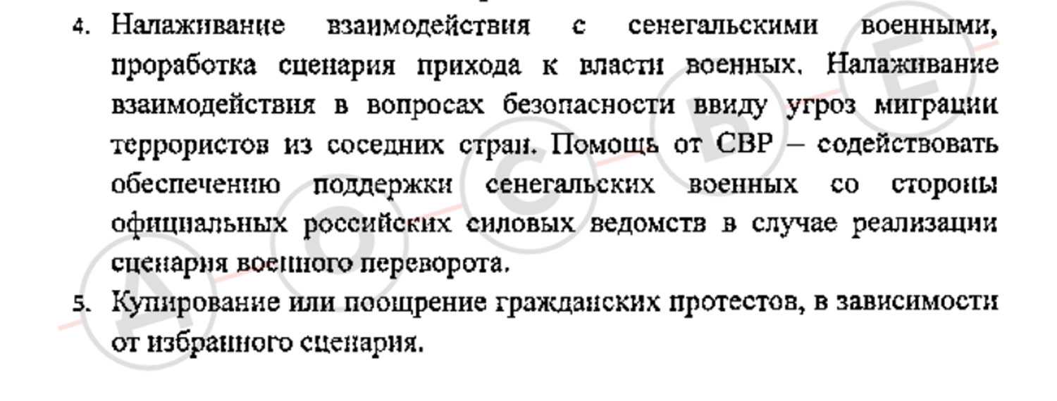 В документах упоминается, что политологи прорабатывали сценарий военного переворота в Сенегале — правда, неясно, планировали ли они сами поучаствовать в смене власти или же просто готовились к такому развитию событий, считая его вероятным. Если бы переворот удался, сотрудники «Африканской политологии» рассчитывали, что СВР обеспечит сенегальским военным поддержку со стороны российских силовых ведомств.