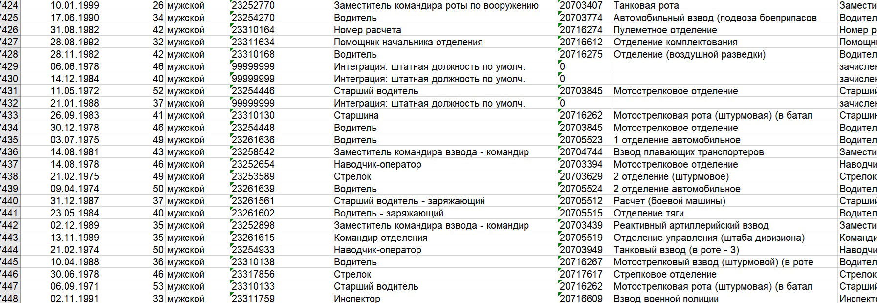 Не только рассказал. Покидая армию, Миллер взял с собой списки всего личного состава 27-й мотострелковой дивизии, в которой он служил, за период с начала 2024 года по январь 2025-го включительно. С указанием каждого военнослужащего, назначенного на воинскую должность, начиная от комдива и заканчивая музыкантом военного оркестра. Благодаря этому документу можно увидеть, какие потери несут воюющие соединения российской армии, кто и как в них служит, кто именно погибает и кто остается в живых.