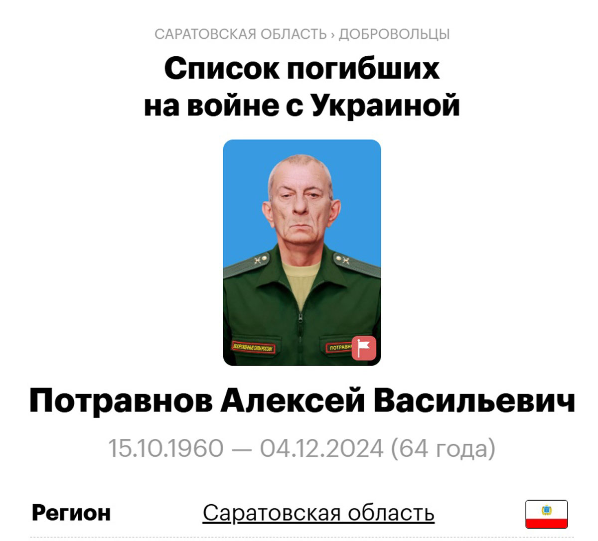 Одному из старейших военнослужащих полка, рядовому Александру Потравнову, было 64 года. Он погиб в декабре 2024-го.