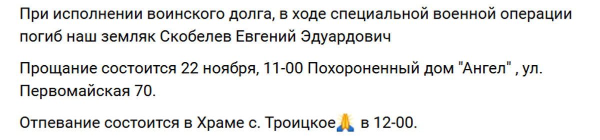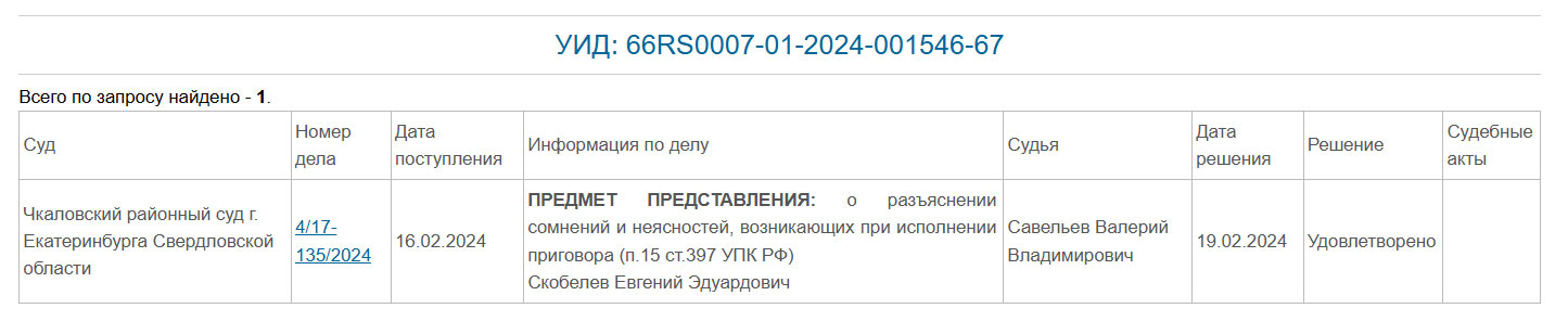 В марте 2024 года Чкаловский районный суд Свердловской области рассмотрел некий материал о «сомнениях и неясностях» при исполнении приговора, а в апреле 2024 года Скобелев подписал контракт и оказался в 27-й дивизии. Он погиб осенью 2025 года.